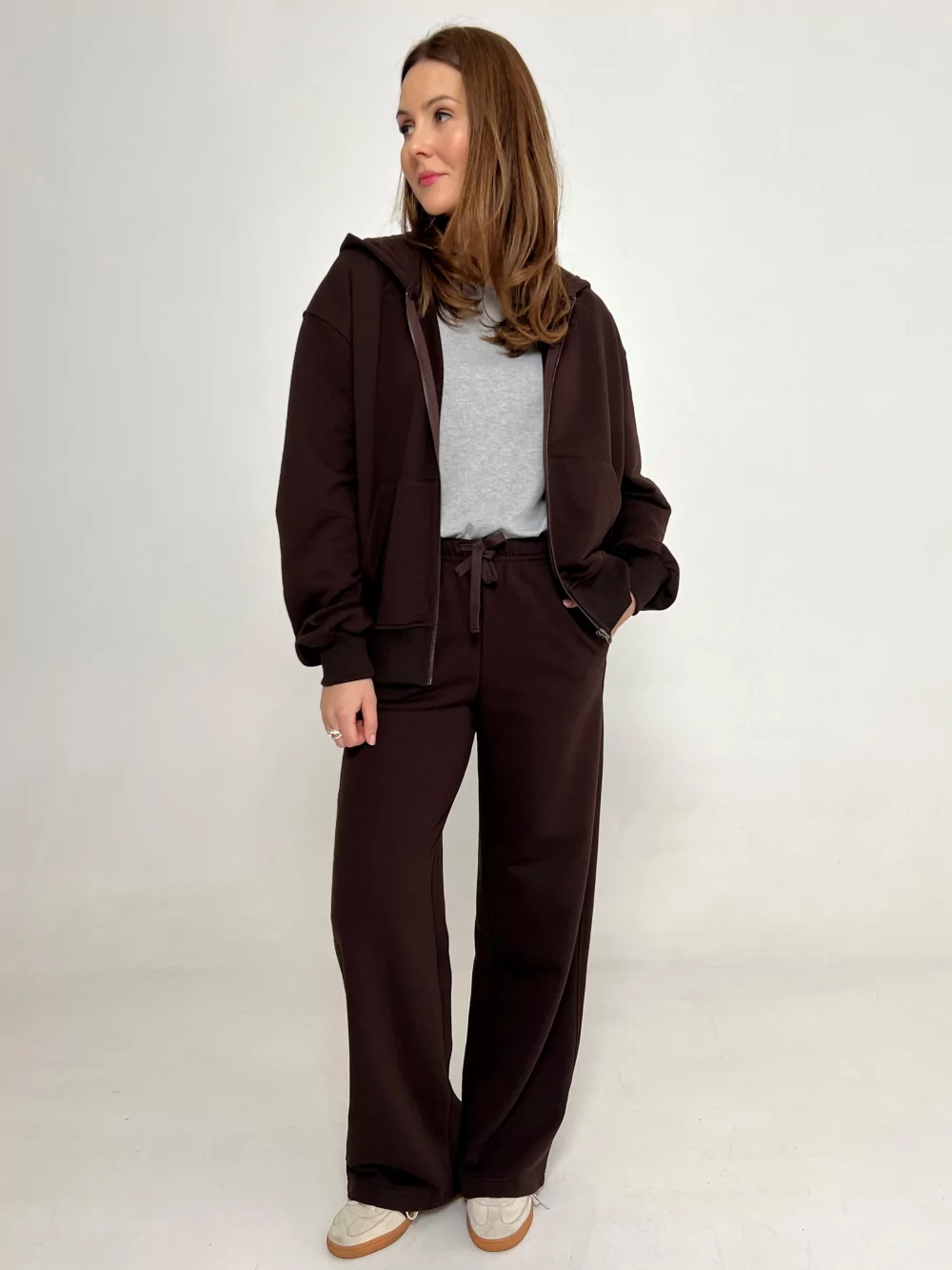 Podwyższony stan i poszerzone nogawki wysmuklają sylwetkę. Spodnie posiadają dwie głębokie kieszenie. W pasie jest wszyta gumka, która dopasuje się do każdej sylwetki. Wykonane są z mięsistej dzianiny. Uszyte i zaprojektowane w Polsce.