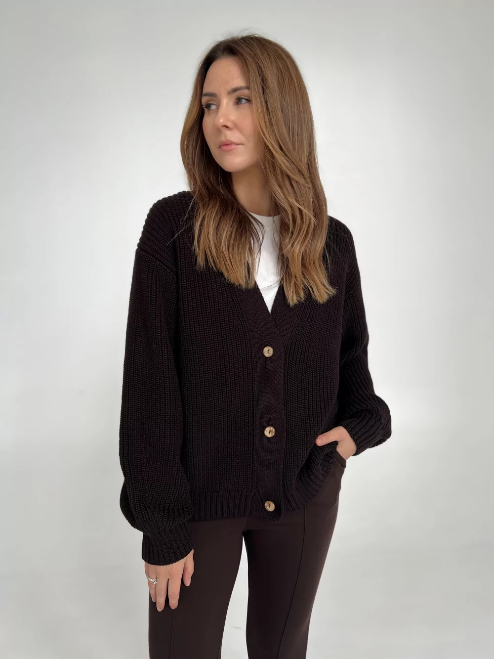 Kardigan o klasycznym fasonie wykonany w Polsce z mięsistej i przyjemnej w dotyku przędzy.