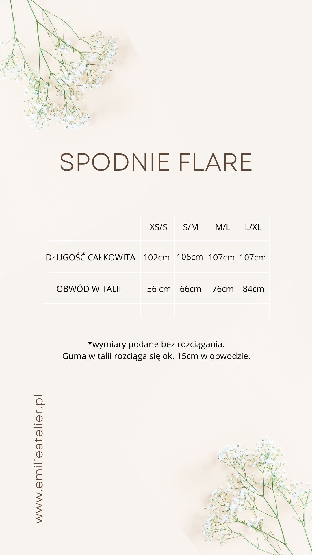Ich charakterystyczna forma w kształcie litery "A" sprawia, że optycznie wysmuklają i wydłużają nogi, nadając eleganckiego i kobiecego wyglądu. Spodnie Flare są wygodne i uniwersalne, można je nosić na wiele różnych okazji - zarówno na co dzień, do pracy, jak i na wieczorne wyjścia. Dzięki nim stworzysz modny i stylowy look beż dużego wysiłku. Jeśli szukasz wyjątkowych spodni, które dodadzą Twojemu outfitowi klasy i szyku te spodnie będą idealnym wyborem. Zainwestuj w nie, poczuj się modnie i pewnie zawsze i wszędzie!