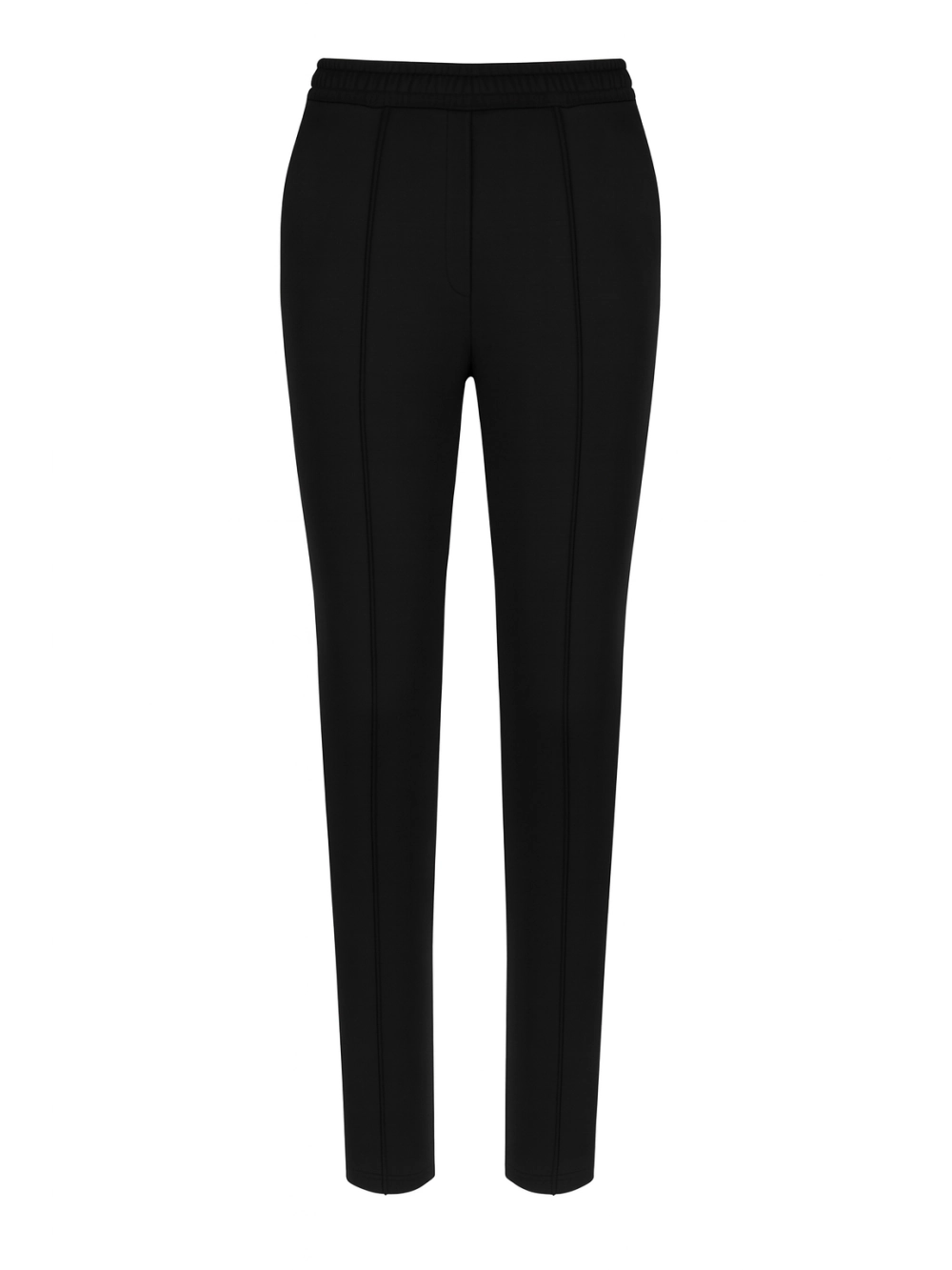 Ten model nie tylko wydłuża nogi i wyszczupla sylwetkę, jest także elegancki i stylowy. Prosty fason sprawdzi się zarówno na co dzień jak i podczas ważnych uroczystości. Pionowe przeszycie na przodzie dodatkowo wysmukła sylwetkę. To bardzo wygodne i wielozadaniowe spodnie, które idealnie dopasują się do sylwetki. Wykonane zostały z dzianiny posiadającej certyfikat OEKO-TEX Standard 100, który potwierdza przede wszystkim bezpieczeństwo produktu dla środowiska naturalnego oraz ludzi.