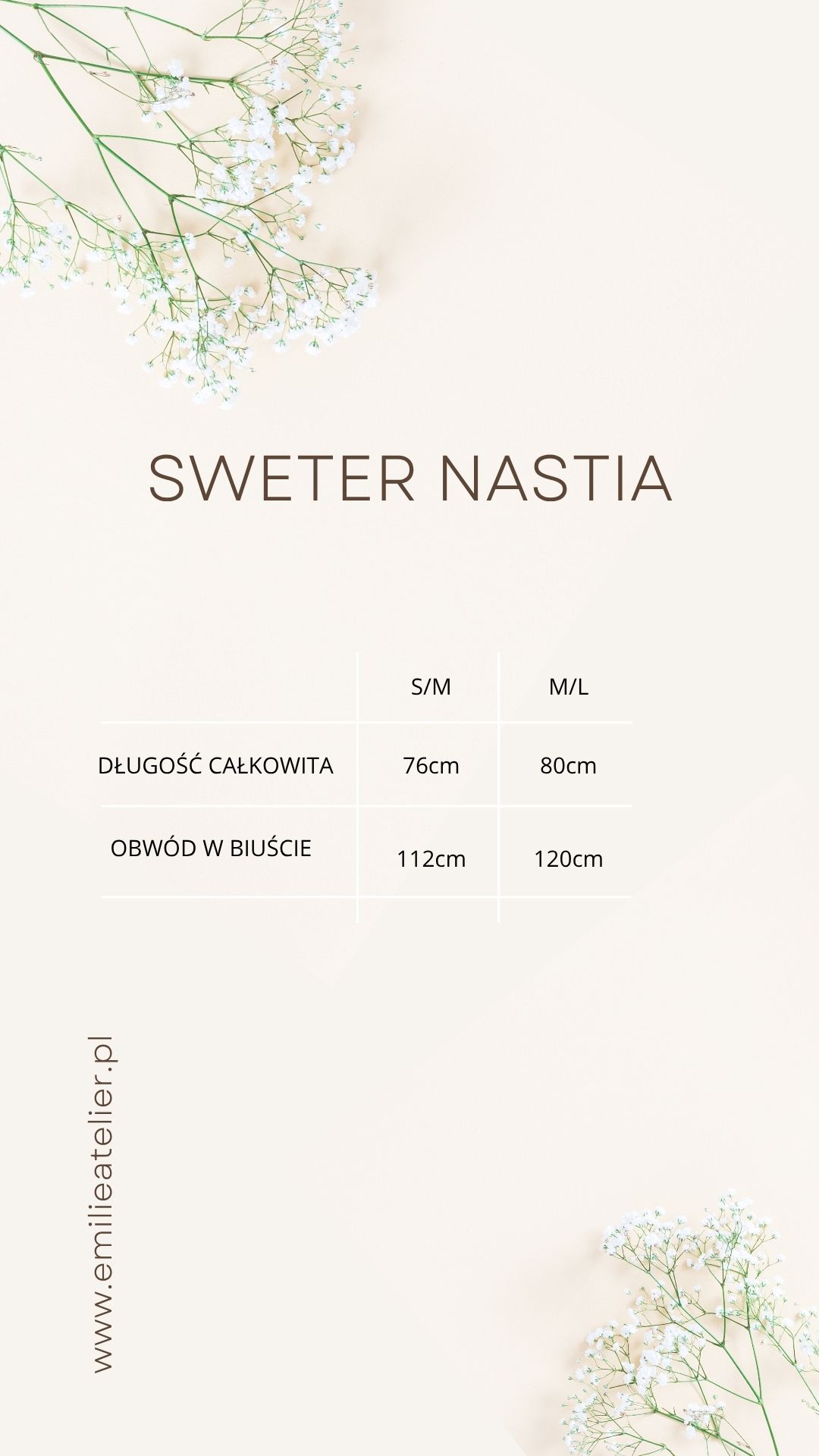 Miękki, otulający i idealny na chłodniejsze dni. Ma luźniejszy, komfortowy fason, który pięknie układa się na sylwetce i daje pełną swobodę ruchów. Po bokach znajdują się rozporki, dzięki którym sweter lepiej pracuje przy chodzeniu i nie „ciągnie się” na biodrach. Wykończony szerokim, elastycznym ściągaczem u dołu oraz przy rękawach - dzięki temu trzyma formę i wygląda elegancko przez wiele sezonów. Naturalna w dotyku dzianina z domieszką bawełny jest przyjemna, niegryząca i idealna na co dzień. Sweter Nastia idealnie sprawdzi się do legginsów lub spodni Vivi.