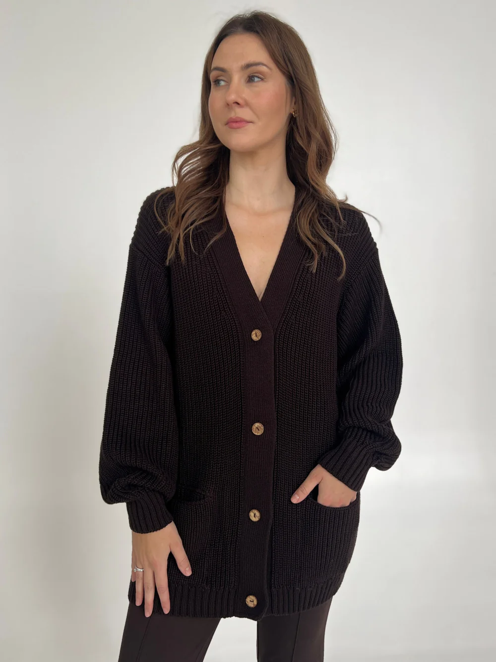 Kardigan o klasycznym fasonie wykonany w Polsce z mięsistej i przyjemnej w dotyku przędzy.