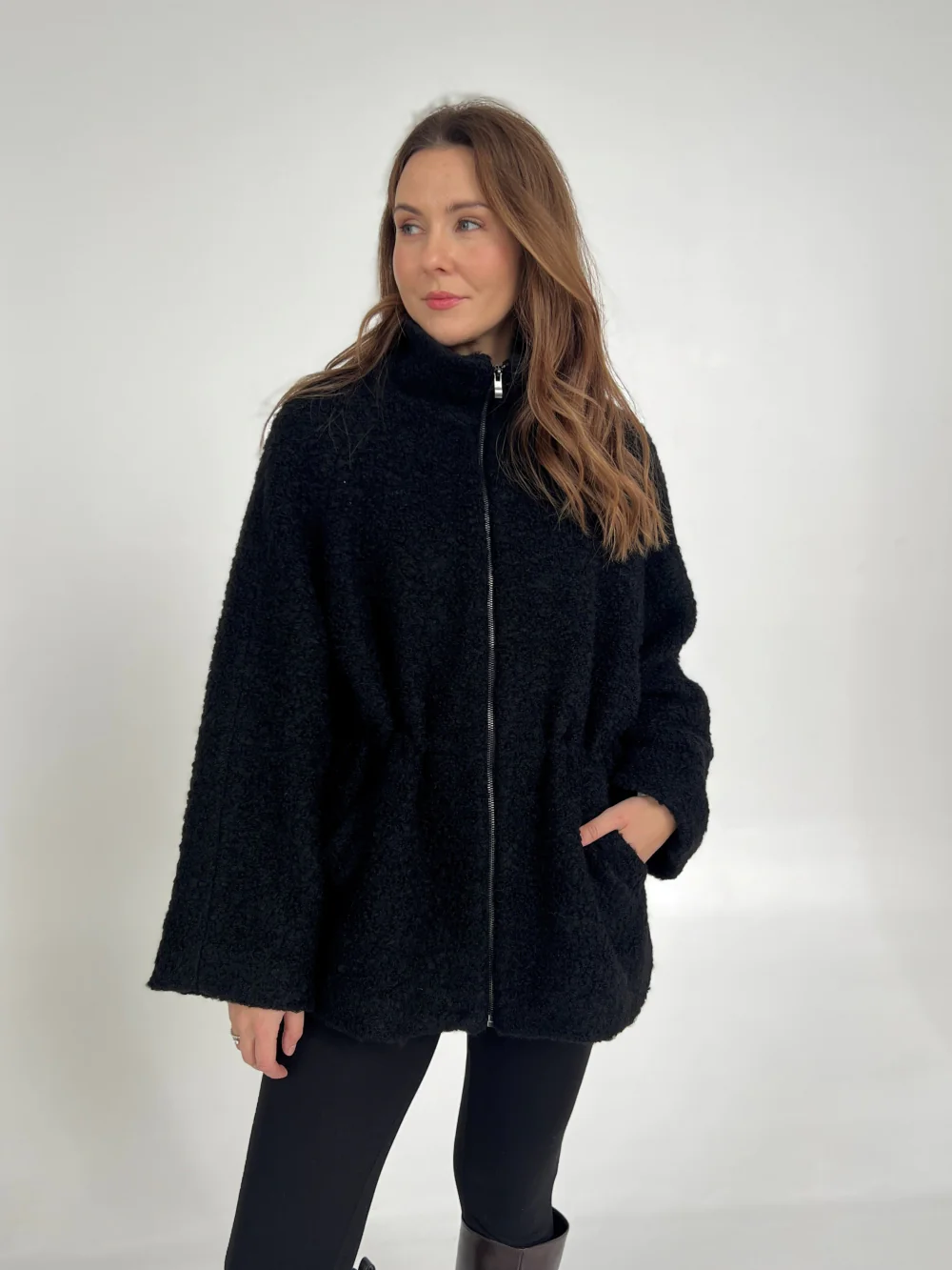 Ciepła, miękka i pięknie otulająca sylwetkę. Ta wełniana kurtka została zaprojektowana tak, aby łączyć wygodę z kobiecą linią. W środku, na wysokości talii, ukryto delikatne ściągacze, dzięki którym możesz zebrać kurtkę i podkreślić proporcje - subtelnie, naturalnie, dokładnie tak, jak lubisz. Model ma zamek na całej długości, wysoki kołnierz chroniący przed chłodem i duże, praktyczne kieszenie. Puszysta struktura tkaniny dodaje jej nowoczesnego, przytulnego charakteru.