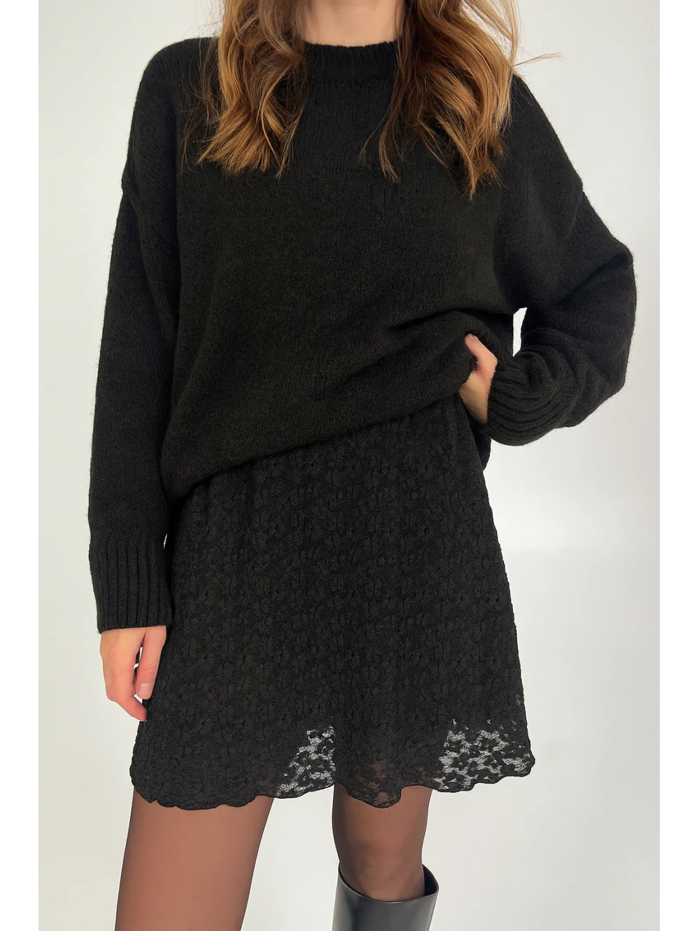 Lekka, kobieca spódniczka o subtelnie rozkloszowanym kroju, uszyta z delikatnej koronki o drobnym, przestrzennym wzorze. Posiada miękką podszewkę, która zapewnia komfort noszenia, a przy dolnej krawędzi pozostawia delikatny, elegancki prześwit koronki. Model pięknie układa się w ruchu i tworzy idealne połączenie zarówno z miękkimi swetrami, jak i gładkimi topami. Wygodna gumka w pasie dopasowuje się do sylwetki i gwarantuje komfort przez cały dzień. Świetnie komponuje się ze swetrem Noelle, tworząc spójny, szykowny zestaw na wiele okazji.