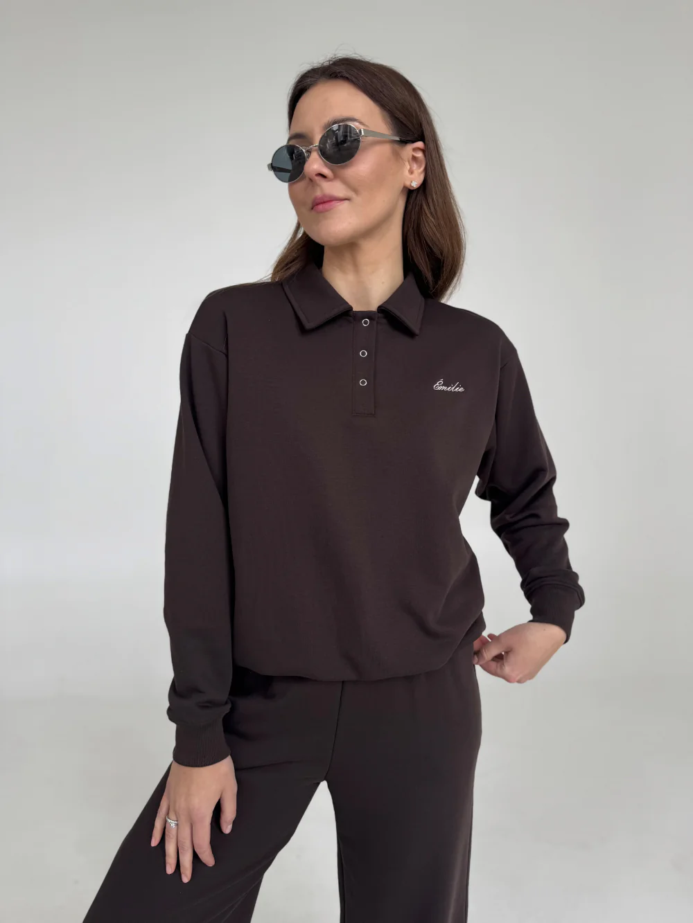 Uszyta z wysokiej jakości bawełny o miękkim, przyjemnym chwycie, otula sylwetkę i daje poczucie swobody przez cały dzień. Kołnierzyk inspirowany klasycznym polo i subtelne zapięcie nadają jej bardziej wyjściowego charakteru, dzięki czemu możesz nosić ją nie tylko w domowym rytmie, ale też poza nim. Delikatne haftowane logo ÉMILIE podkreśla jej dopracowany, ponadczasowy styl. To bluza, która wygląda lekko, ale zostaje z Tobą na długo - w codzienności, w ruchu, w chwilach dla siebie. W komplecie ze spodniami Soft tworzy spójny, dopracowany look.