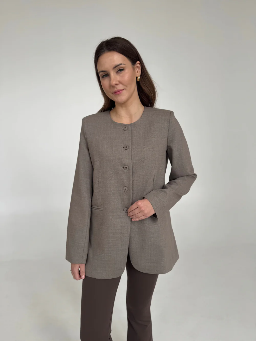 Taliowana marynarka, która subtelnie podkreśla sylwetkę i nadaje całości eleganckiego, uporządkowanego charakteru.