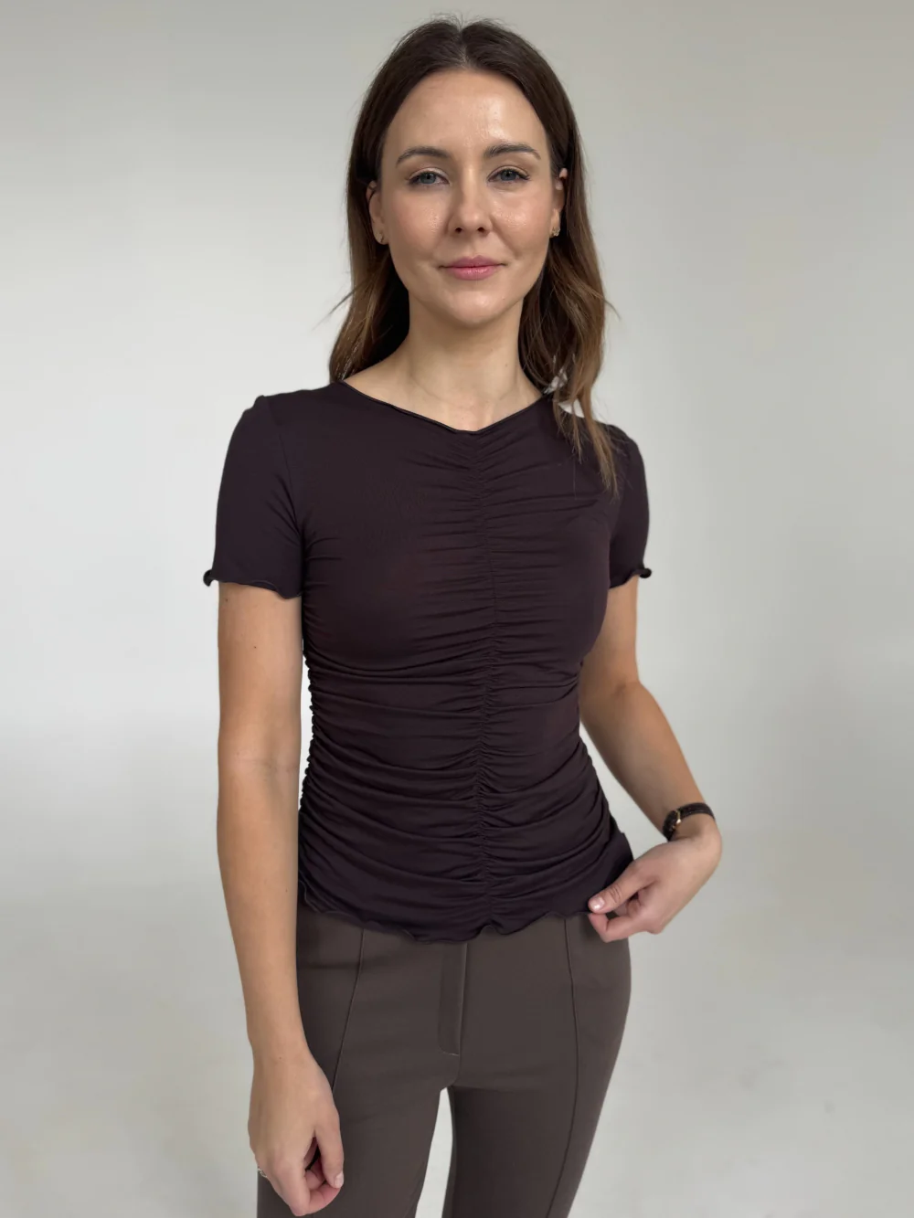 Minimalistyczny fason z krótkim rękawem pięknie dopasowuje się do sylwetki, podkreślając kobiecą linię bez uczucia skrępowania. Miękki, elastyczny materiał sprawia, że bluzka doskonale układa się na ciele i jest niezwykle przyjemna w noszeniu przez cały dzień. To idealna baza do codziennych i bardziej eleganckich stylizacji - świetnie wygląda zarówno z jeansami, jak i ze spódnicą czy spodniami garniturowymi. Klasyczny krój i uniwersalny charakter sprawiają, że jest to model, do którego będzie się wracać sezon po sezonie.